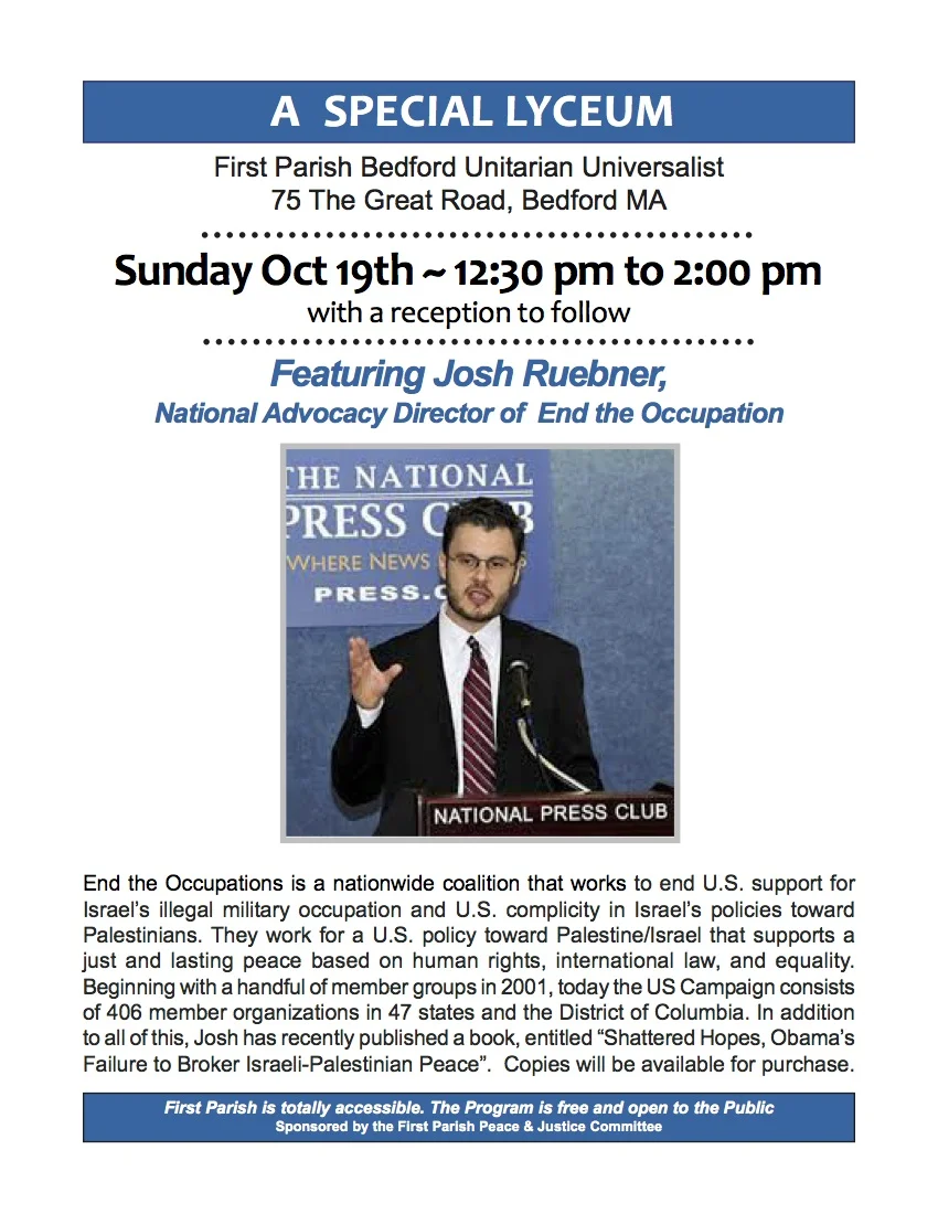 The First Parish Church Peace & Justice Committee present a "Special Lyceum" with Josh Ruebner, National Advocacy Director of the US Campaign to End the Israeli Occupation
