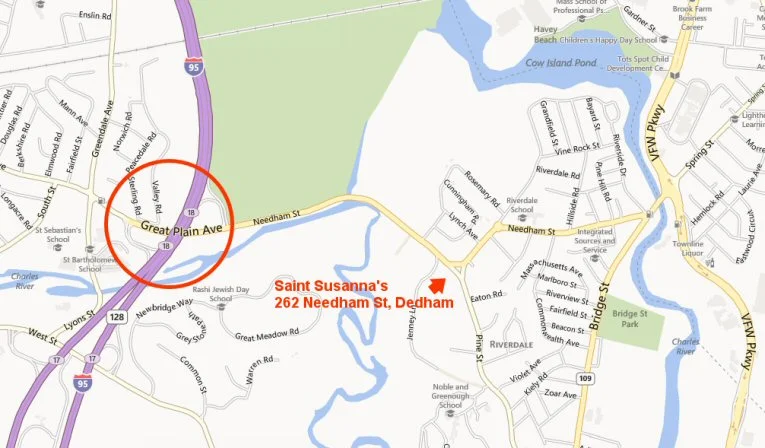 Directions: From Exit 18 off Route 95, head east, in the direction of West Roxbury. The church is one mile from the highway exit, on the right.