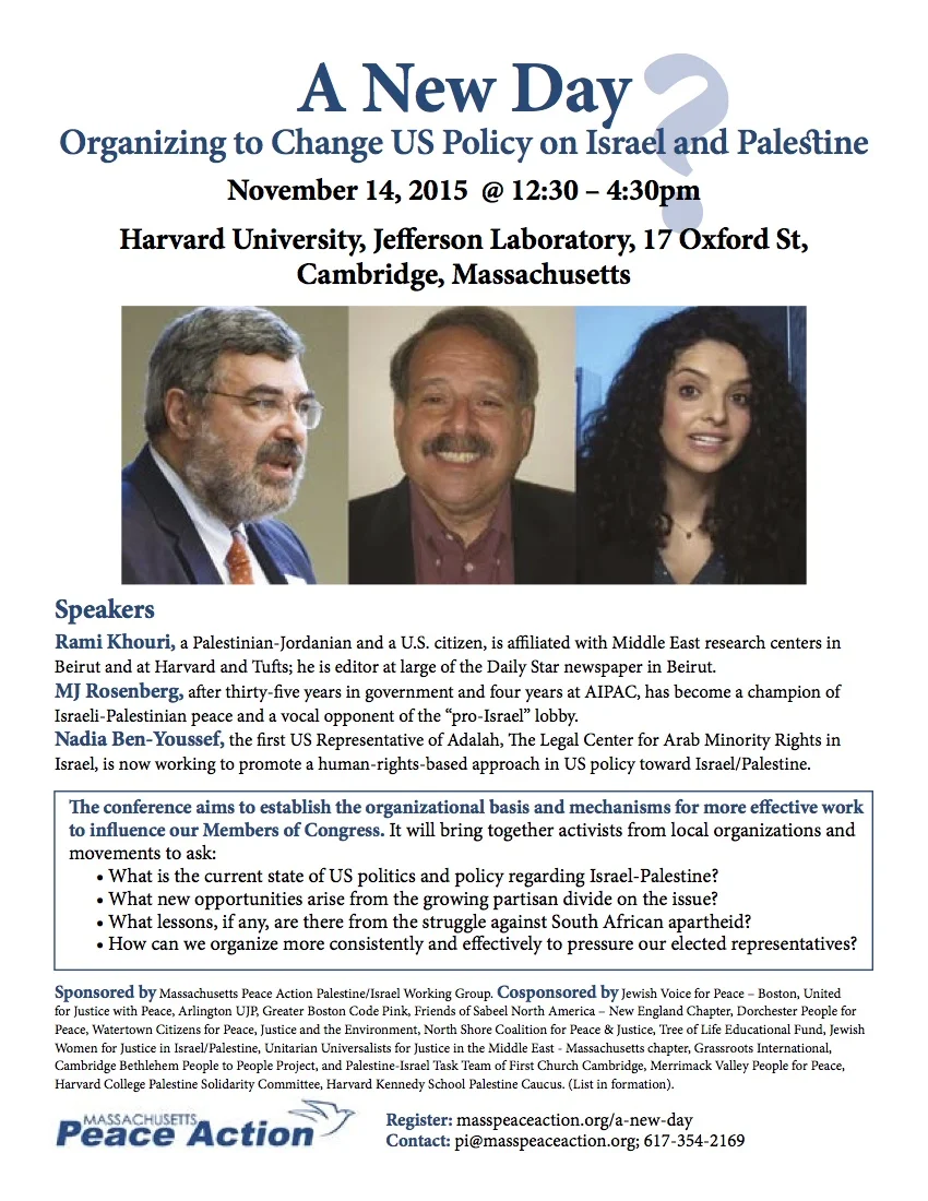 The “New Day” Conference will be an occasion to lay the groundwork for a coordinated and sustained effort to demonstrate to members of the Massachusetts Congressional Delegation that increasing numbers of their constituents disapprove of a foreign policy that indulges, justifies and even rewards Israel’s mistreatment of Palestinians – and cynically manipulates an illusory “peace process.”