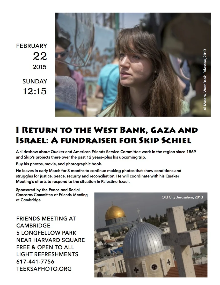 Skip will present an excerpt from one of his most recent slideshows about the region, “Border Zones,” and sell his photos, movie (“Eyewitness Gaza” about his work in the region), and photographic book (also titled “Eyewitness Gaza”). He expects to leave for the region in early March for 3 months to continue making photos that show conditions and struggles for justice, peace, security and reconciliation. In particular, he will coordinate with FMC’s efforts to respond to the situation in Palestine-Israel.