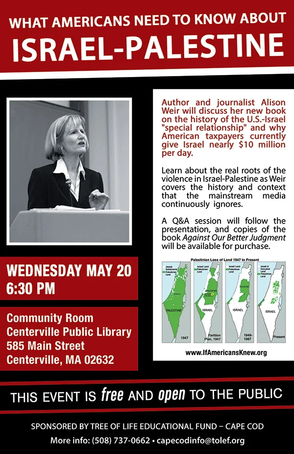 Author/activist Alison Weir discusses her latest book “Against Our Better Judgment: The Hidden History of How the U.S. Was Used to Create Israel”