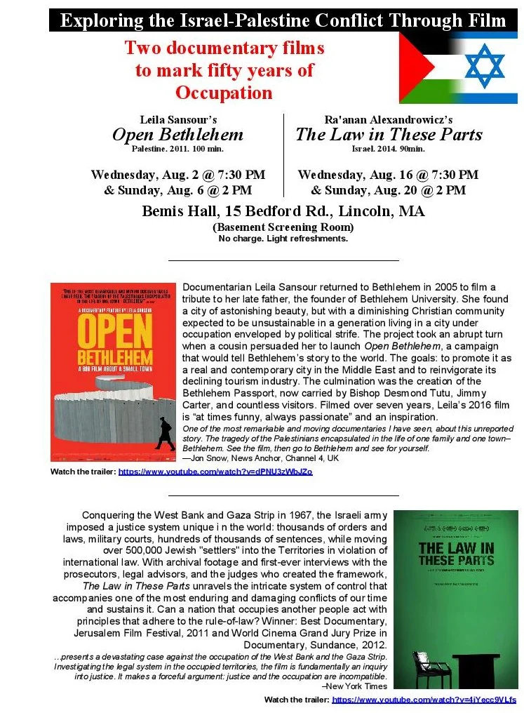 The Film "Open Bethlehem" will be shown on Sunday, August 6 at 2 PM